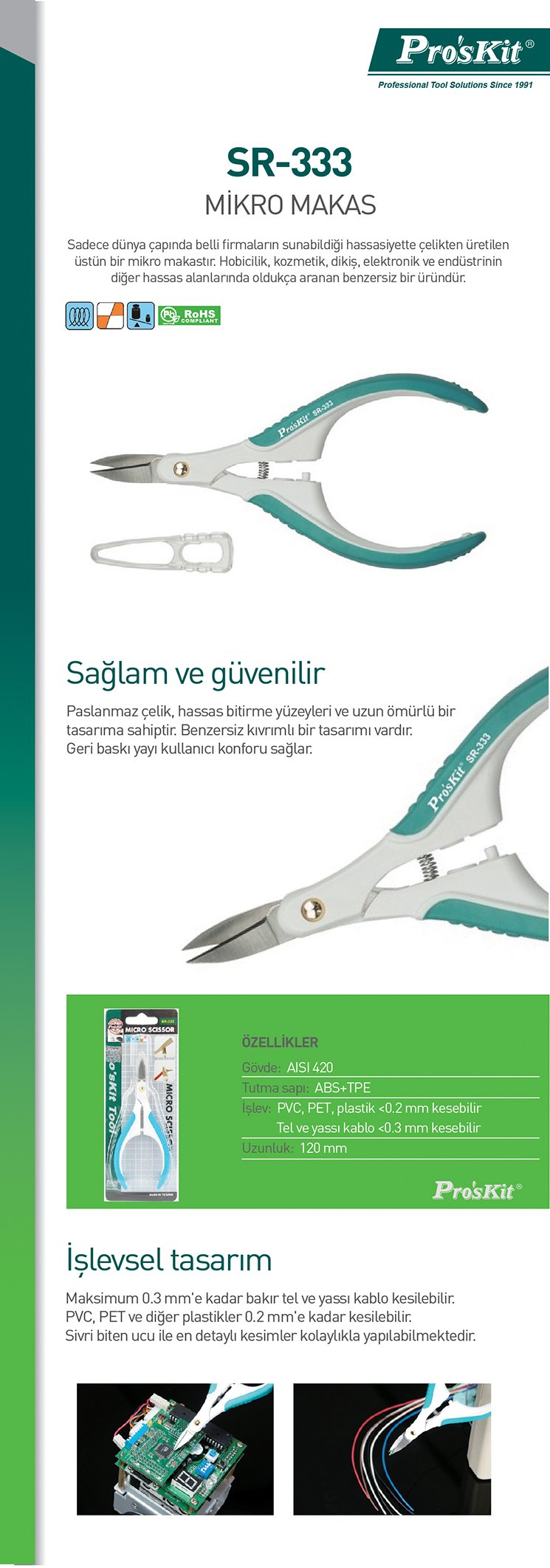 Proskit SR-333, ergonomik tasarımı ve gerilimli yay mekanizması sayesinde rahat ve yumuşak bir kullanım sunar. Farklı kalınlıklara sahip malzemeleri kesme yeteneği, onu çok yönlü bir araç haline getirir. Elektronik cihazlar üzerinde, özellikle bakır ve IC pinleri gibi ince parçaların kesilmesinde üstün doğruluk sağlar.