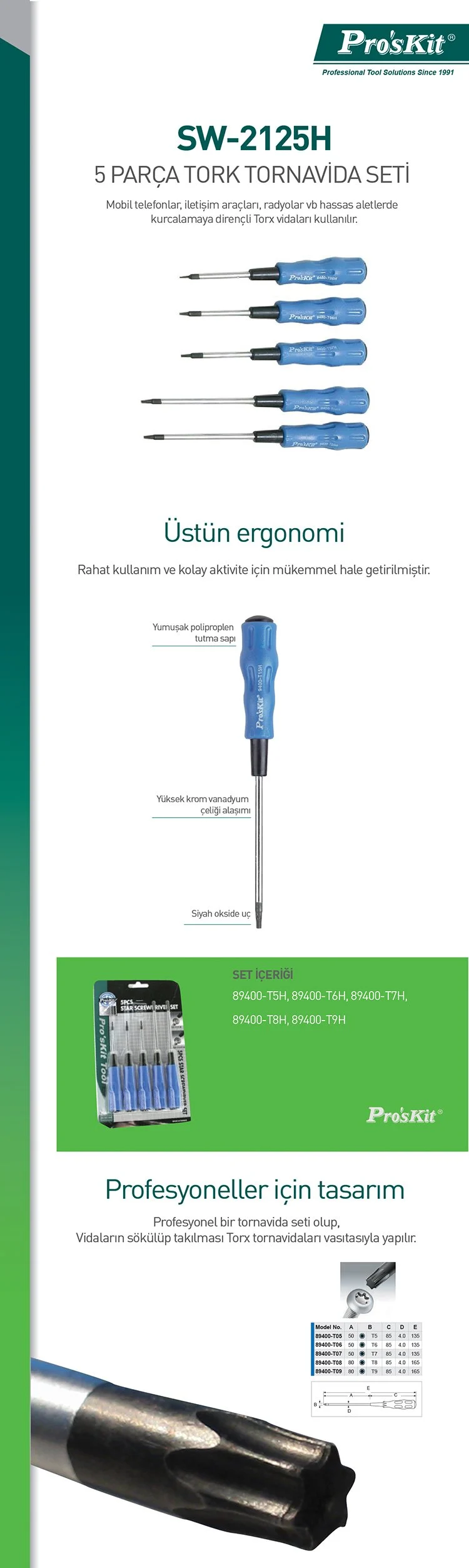 Proskit SW-2125H 5 Parça Tork Tornavida Seti, elektronik ve iletişim cihazlarında güvenli, hassas ve profesyonel bir çalışma deneyimi sunar. T5H’den T9H’ye kadar beş farklı uç ile tüm hassas montaj işlemleri için idealdir. Kalite, güvenlik ve ergonomiyi bir arada sunan bu set, teknik servislerin ve elektronik meraklılarının vazgeçilmez yardımcısıdır.