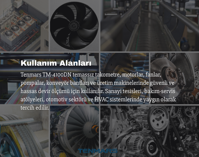 - Tenmars TM-4100DN Takometre; makine, motor, otomotiv ve taşıt endüstrisi başta olmak üzere birçok farklı sektörde kullanılan, yüksek hassasiyetli bir dönüş hızı ölçüm cihazıdır.